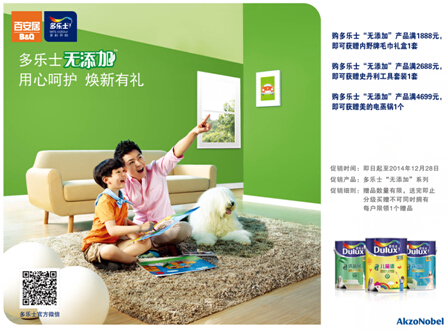 為了能讓更多的家庭享受和體驗多樂士環保無添加產品的優異環保品質,從即日起到2014年12月28日多樂士聯合百安居,在廣州、深圳百安居指定門店舉行“多樂士無添加,用心呵護,煥新有禮”的大型團購活動。以豐厚的回饋感謝廣大消費者對多樂士無添加的喜愛和關注。