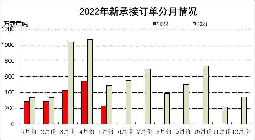 1~5月,50家重點監測的造船企業完工出口船1230萬載重噸,同比下降23.4%;承接出口船訂單1546萬載重噸,同比下降46.4%;5月末手持出口船訂單8981萬載重噸,同比增長21.3%。出口船舶分別占重點造船企業完工量、新接訂單量、手持訂單量的89.5%、93.7%和90.7%。