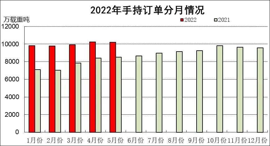 1~5月,50家重點監測造船企業造船完工1375萬載重噸,同比下降17.6%。承接新船訂單1650萬載重噸,同比下降48.4%。5月底,手持船舶訂單9899萬載重噸,同比增長19.4%。