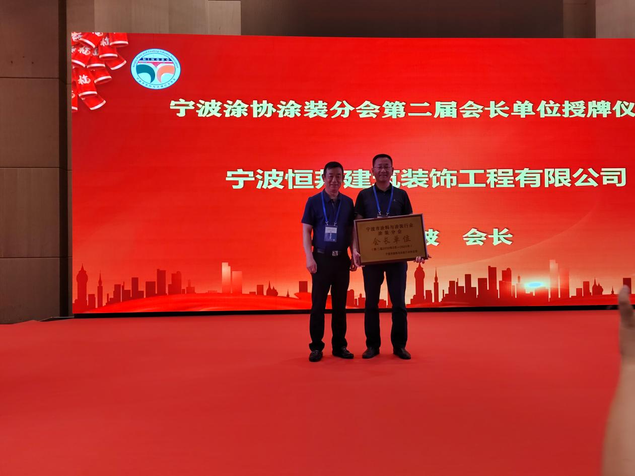 汪立波會長為當選寧波市涂料與涂裝行業(yè)協(xié)會涂裝分會第二屆會長單位及會長——寧波恒邦建筑裝飾工程有限公司李世良總經(jīng)理授牌。