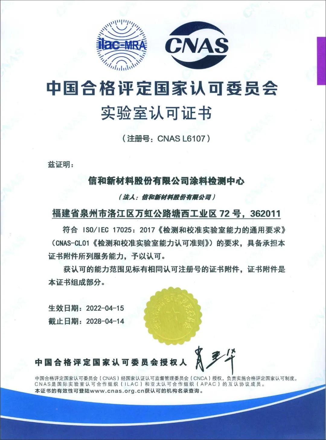 日前,信和新材料股份有限公司涂料檢測中心再獲國家級權(quán)威認(rèn)證,榮獲CNAS實驗室認(rèn)可。