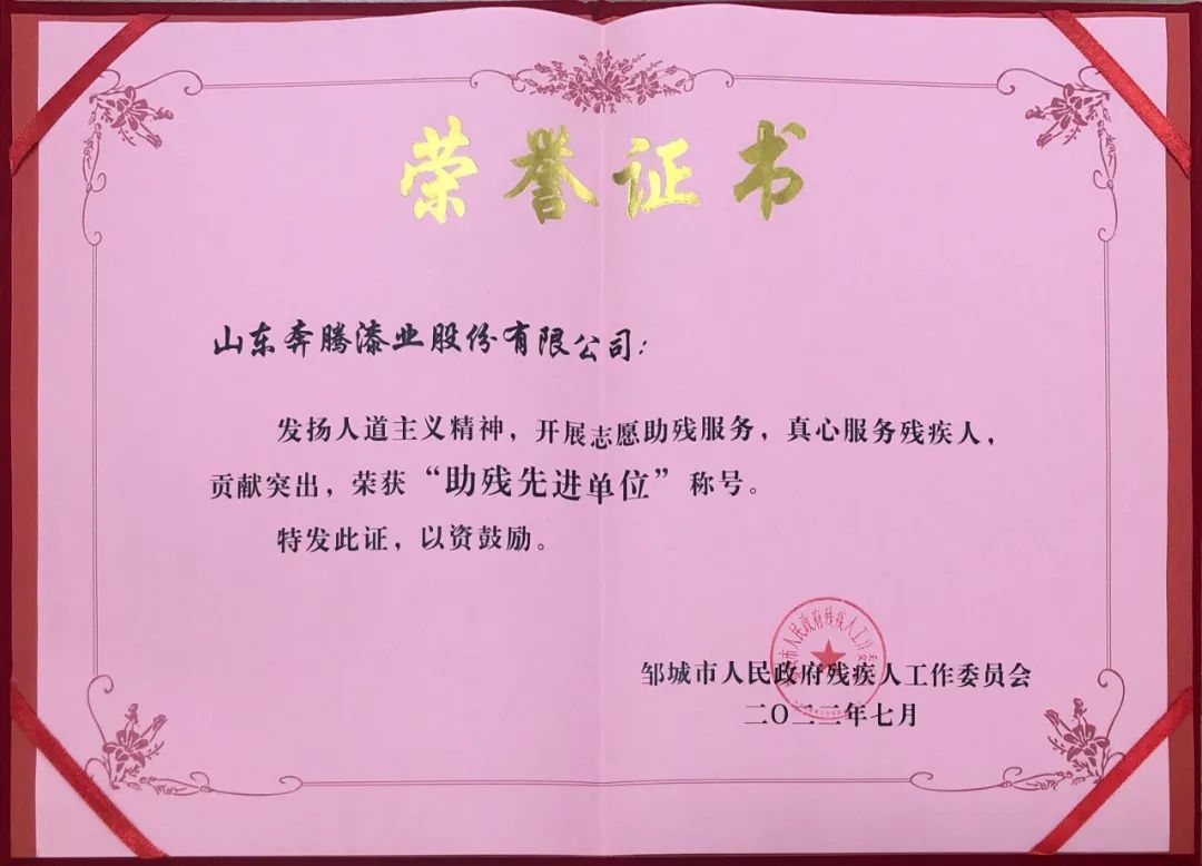 榮譽|山東奔騰漆業股份有限公司榮獲“鄒城市愛心助殘先進單位”榮譽稱號