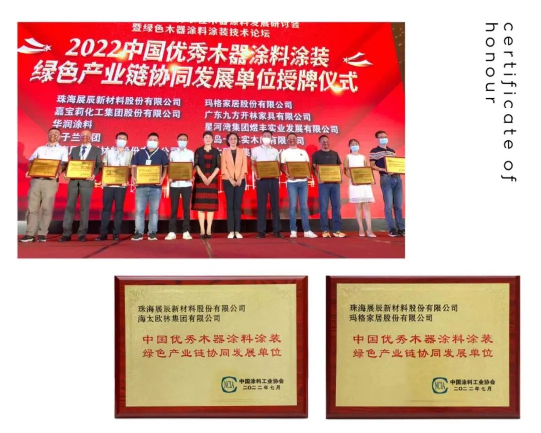 展辰新材與海太歐林、南洋胡氏家具、群升集團、百得勝智能家居、喜夢寶家居、瑪格家居一起,被評為“2022中國優秀木器涂料涂裝綠色產業鏈協同發展單位”。