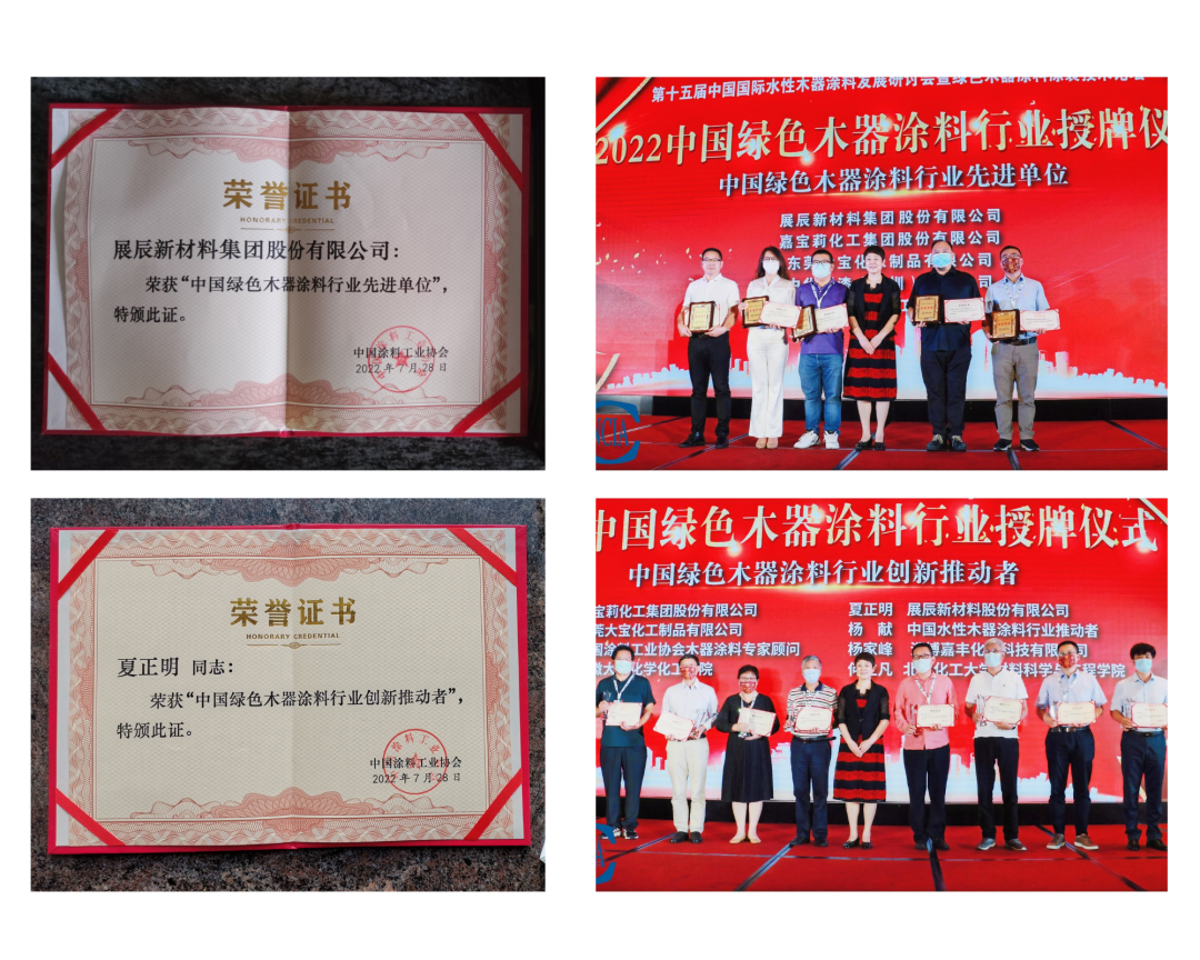 展辰新材料集團股份有限公司榮膺“中國綠色木器涂料行業先進單位”稱號,同時展辰新材料集團股份有限公司夏正明榮獲“中國綠色木器涂料行業創新推動者”稱號。