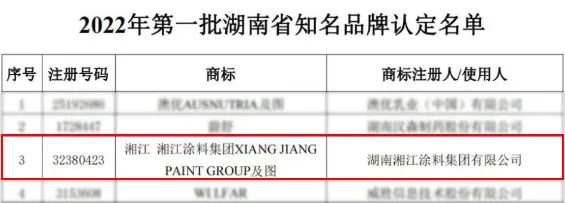 入圍|湘江涂料入選2022年第一批湖南省知名品牌