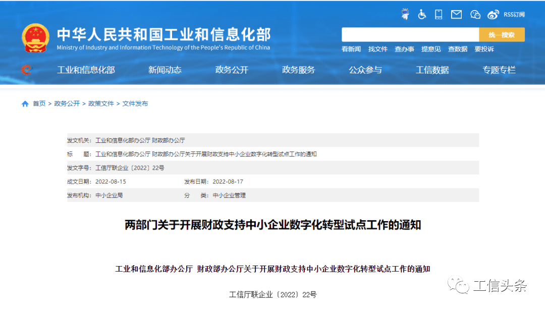 據工信部8月17日消息,工信部、財政部聯合印發開展財政支持中小企業數字化轉型試點工作的通知。