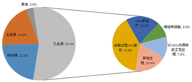表面涂裝VOCs排放量:據相關科研單位估算,表面涂裝排放占工業源的21.6%,占人為源的12%