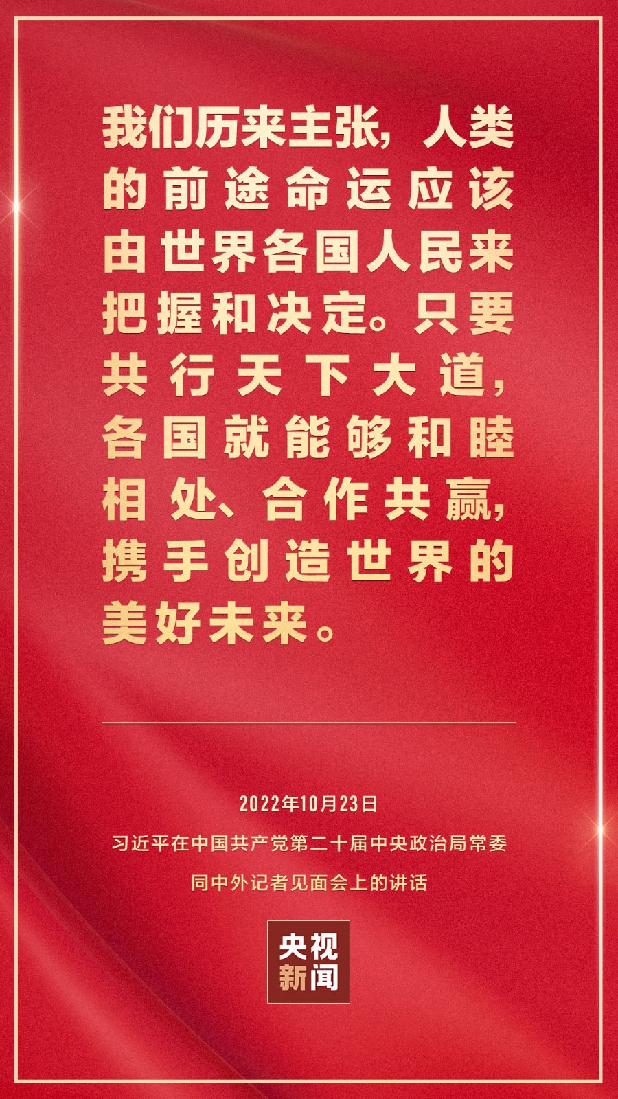 在中國(guó)共產(chǎn)黨第二十屆中央委員會(huì)第一次全體會(huì)議上當(dāng)選的中共中央總書記習(xí)近平和中共中央政治局常委李強(qiáng)、趙樂際、王滬寧、蔡奇、丁薛祥、李希,23日中午在人民大會(huì)堂同采訪中共二十大的中外記者見面。習(xí)近平發(fā)表重要講話。