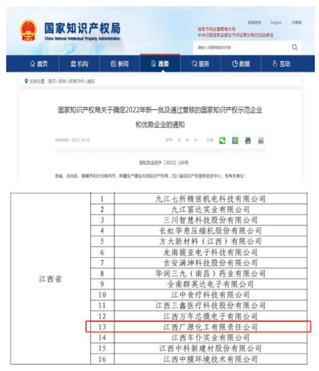 近日,國家知識產(chǎn)權(quán)局發(fā)布《關(guān)于確定2022年新一批國家知識產(chǎn)權(quán)優(yōu)勢企業(yè)的通知》,江西廣源化工有限責(zé)任公司成功上榜“國家知識產(chǎn)權(quán)優(yōu)勢企業(yè)”,這標(biāo)志著公司在知識產(chǎn)權(quán)工作邁上更高的臺階。