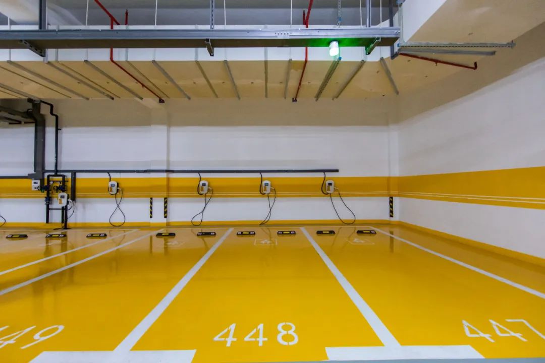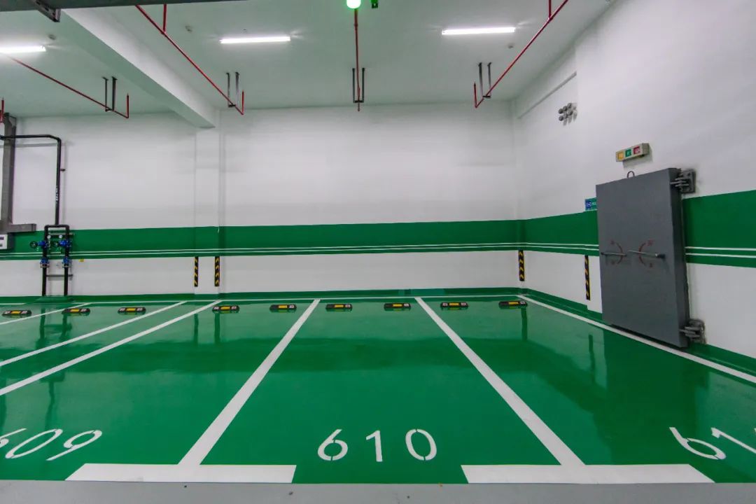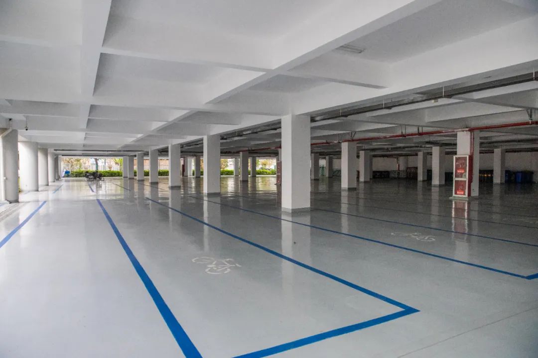 考慮到行車道走車頻繁,對地坪的耐磨性及強度要求相對較高;為保證行人安全和降低行車噪音,且具備一定的防滑效果,“傳化漆”品牌為臨平體育中心地下車庫鋪設耐磨防滑的環氧地坪涂料,設計厚度1~2mm。