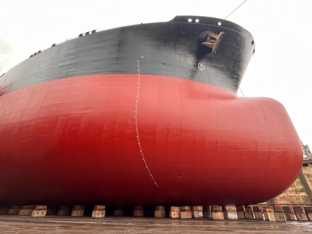 日前,魚童漆助力的30萬載重噸超大型油船(VLCC),在太平洋海洋工程有限公司的巨型船塢內完成塢修保養。