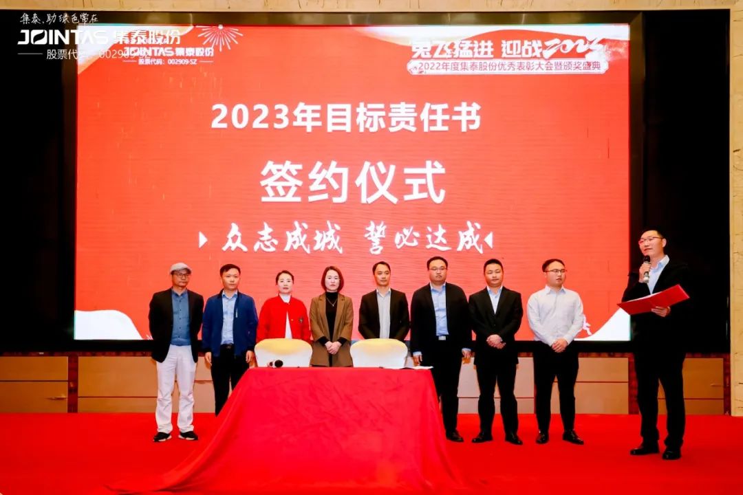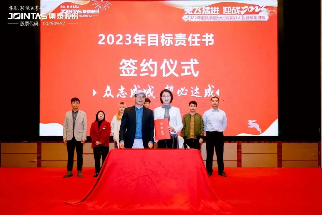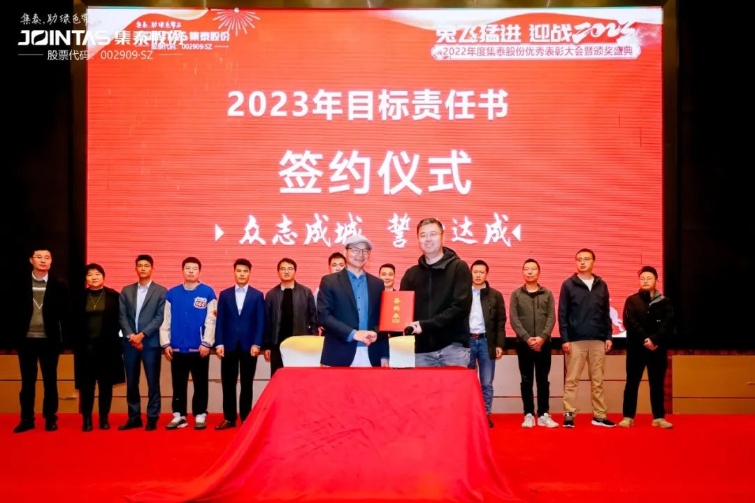 現場還舉行了2023年銷售目標責任書簽約儀式,集泰股份總經理鄒珍凡與各線條總、渠道總簽訂了2023年銷售目標責任書。儀式上,集泰人宣讀目標、誓必達成的口號震聾發聵,飽含力量!