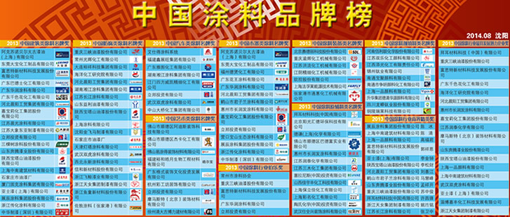 2014年 8月27日,“2013中國涂料品牌榜頒獎典禮”在沈陽隆重舉行。中國涂料工業協會、中國房地產研究會、中華環保聯合會、中國涂料產業技術創新戰略聯盟等多家行業協會的領導出席了頒獎典禮并擔任頒獎嘉賓。出席本次頒獎典禮的還有來自全國的涂料生產企業、涂料用原材料及顏填料生產企業和涂料裝備生產企業的300多名代表。
