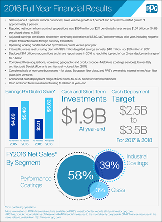 PPG公司董事長兼首席執行官MichaelH.McGarry表示:“盡管全球經濟增長緩慢,各地區表現參差不齊,再加上非常不利的匯率影響,我們第四季度和全年調整后每股攤薄收益仍然實現了穩步增長。通過提高銷量,積極的成本管控,加上多項致力于盈利增長的現金部署,公司在2016年仍然實現了業務發展的各項里程碑。”