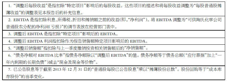 陶氏報表顯示,2013 年每股收益為 3.68 美元,調整后每股收益為2.48 美 元,同比增長31%,而2012 年每股收益 為0.70 美元,調整后每股收益為1.90 美元。